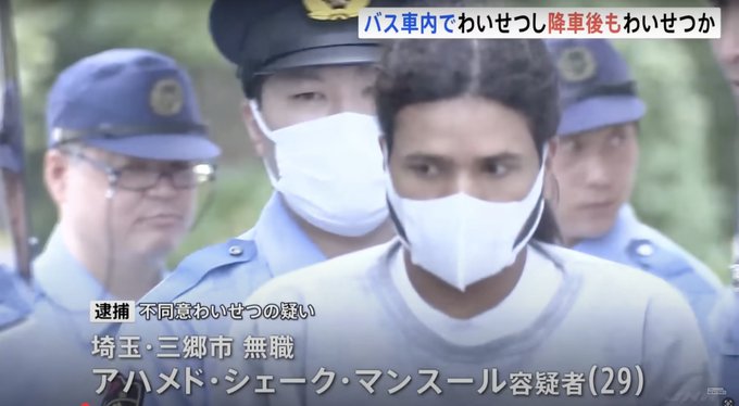 バングラデシュ人の無職アハメド・シェーク・マンスール容疑者(29)、埼玉県三郷市のバス内で女子大学生を性的暴行したとして逮捕「同意していると思った」