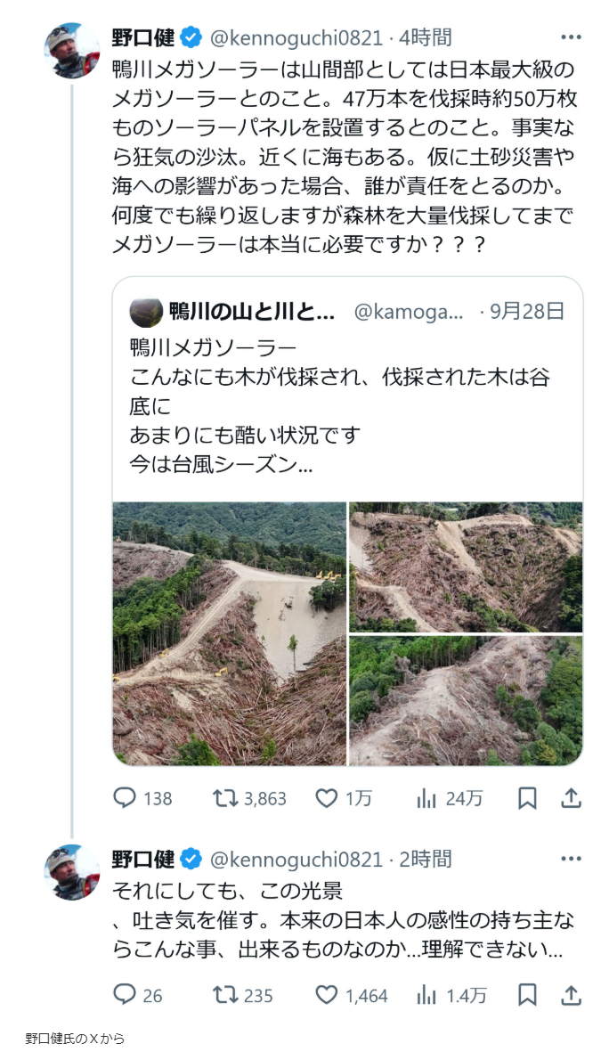 野口氏は、「鴨川の山と川と海を守る会」というアカウントが同メガソーラー建設予定地とされる場所を撮影した写真とともに「こんなにも木が伐採され、伐採された木は谷底にあまりにも酷い状況です」と説明したX投稿を引用。「鴨川メガソーラーは山間部としては日本最大級のメガソーラーとのこと。47万本を伐採時約50万枚ものソーラーパネルを設置するとのこと。事実なら狂気の沙汰。近くに海もある。仮に土砂災害や海への影響があった場合、誰が責任をとるのか」とつづり、「何度でも繰り返しますが森林を大量伐採してまでメガソーラーは本当に必要ですか???」と問いかけた。