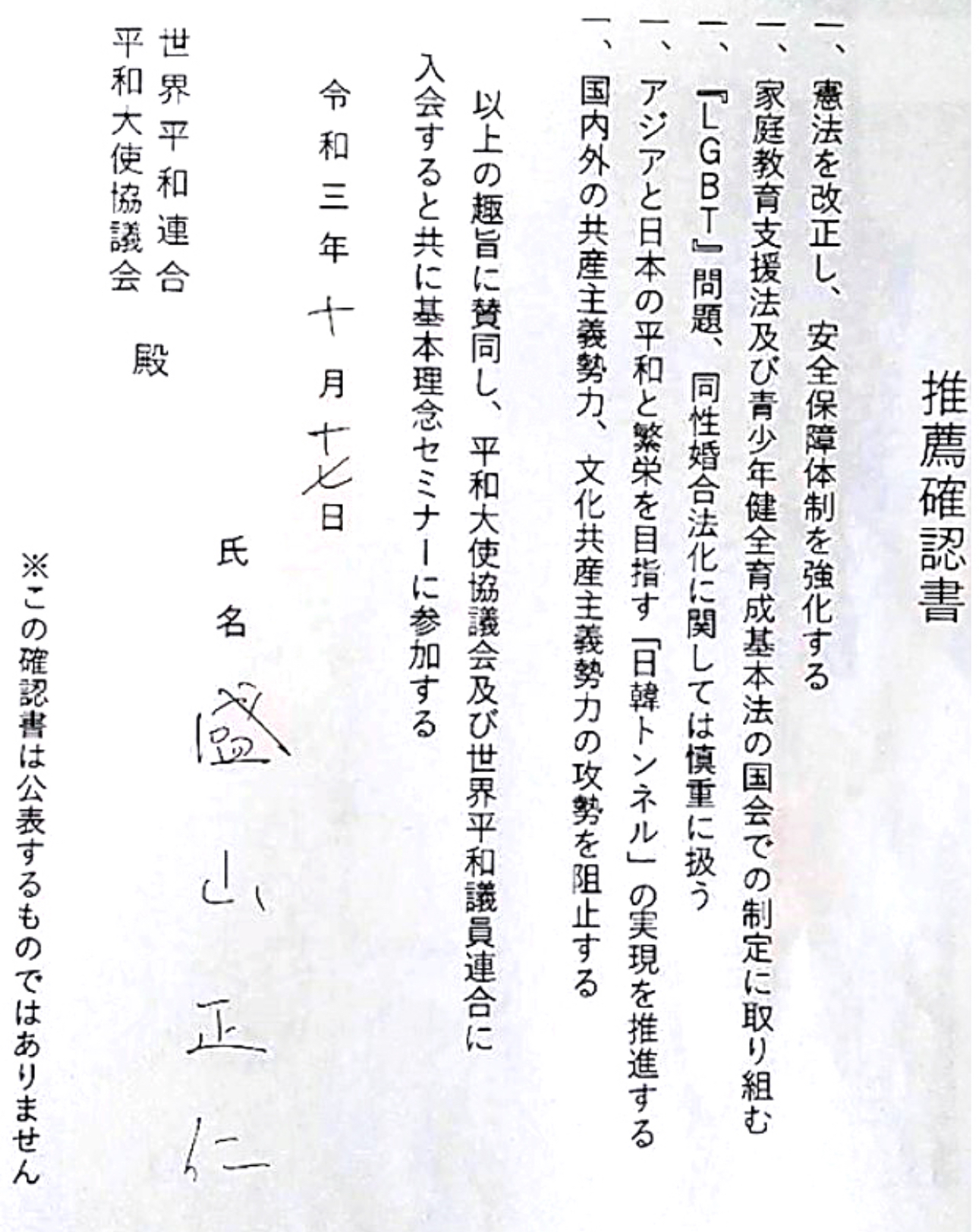 盛山文科相が記憶にないと言っていた教団との推薦確認書。